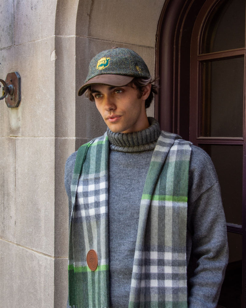 Green Herringbone Tweed Baseball Cap with Leather Bill