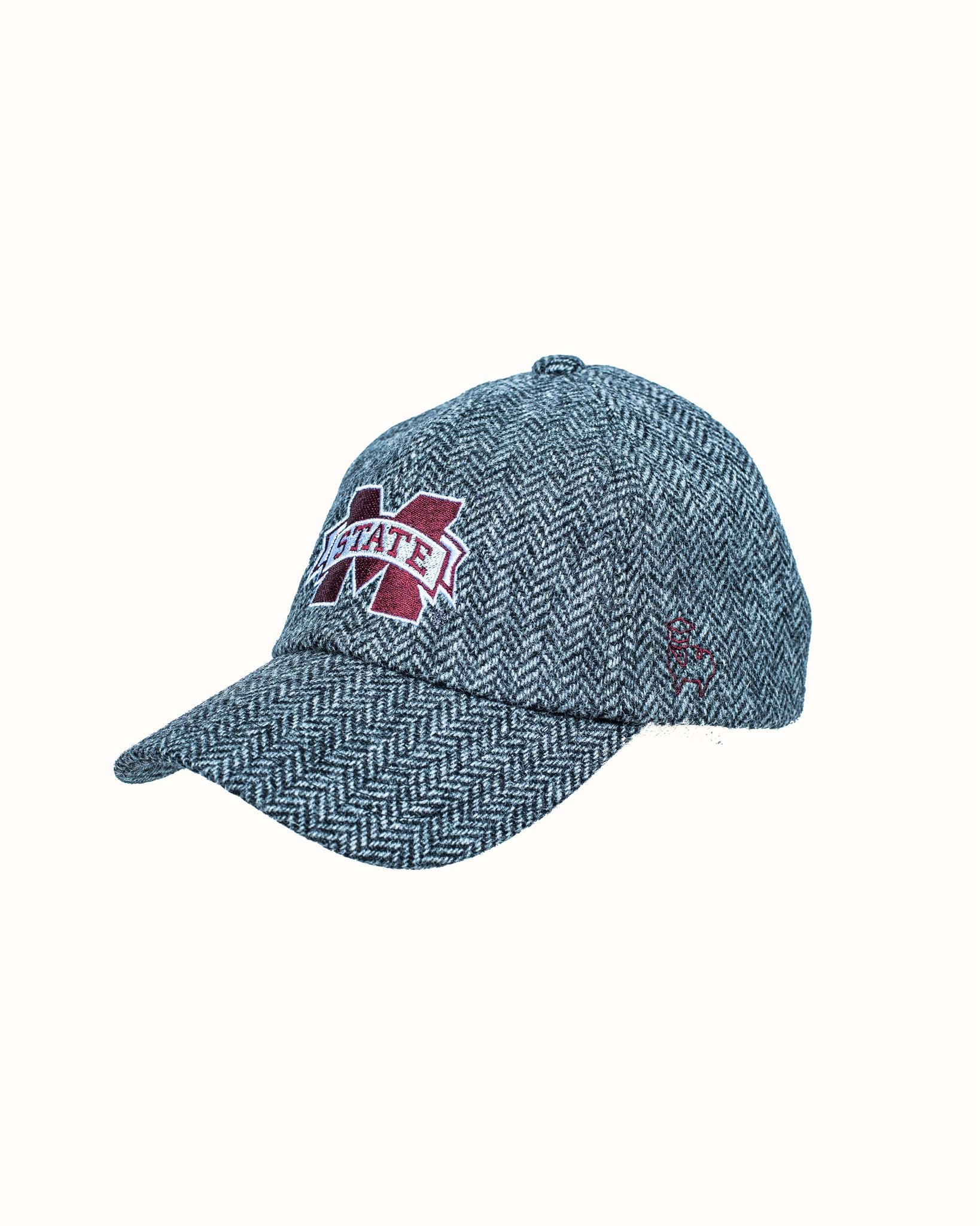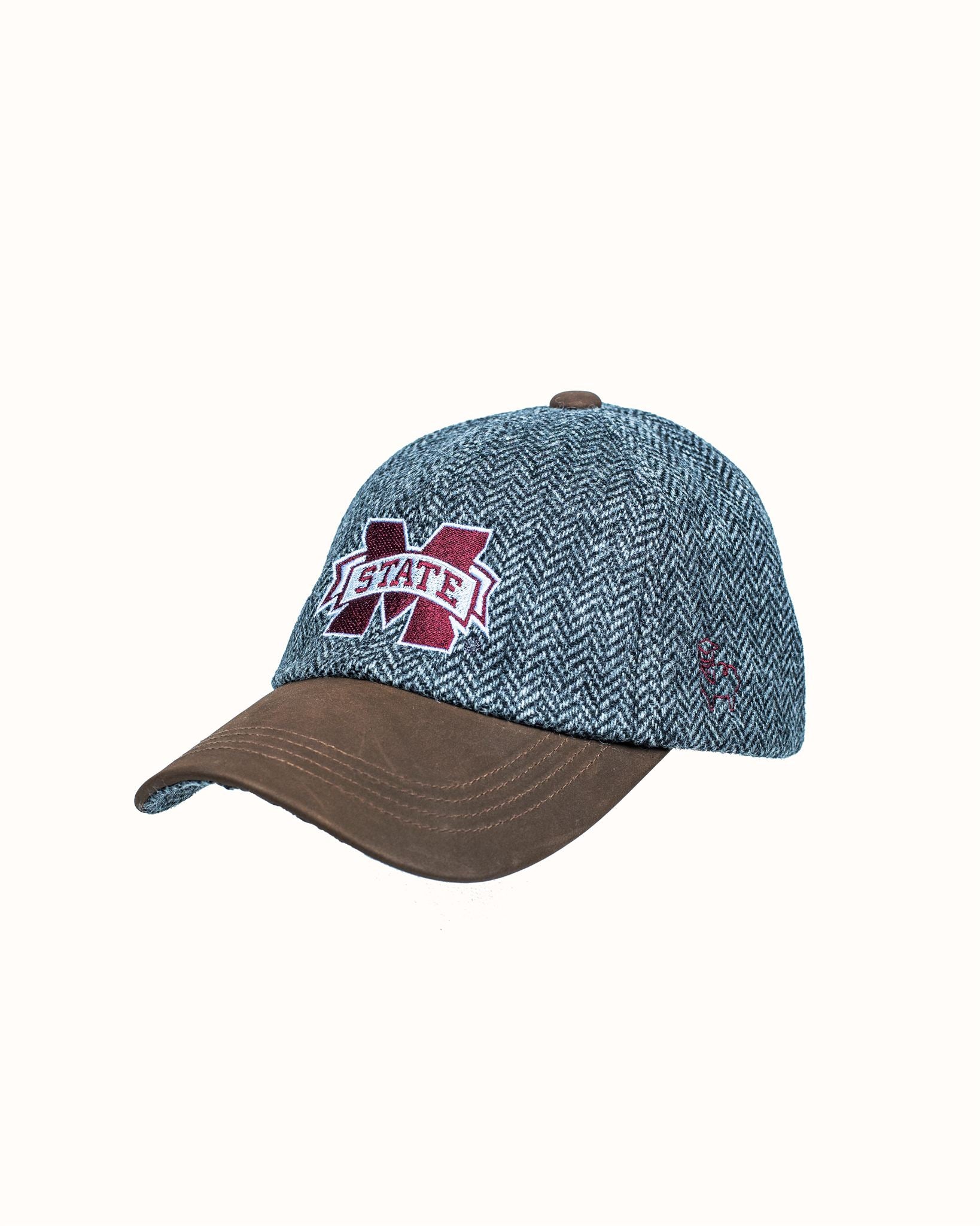 Grey Herringbone Wool Baseball Cap with Leather Bill