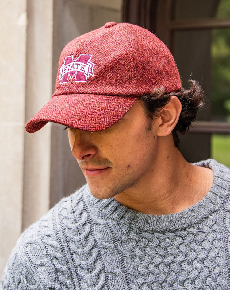 Maroon Herringbone Wool Baseball Cap with Leather Bill