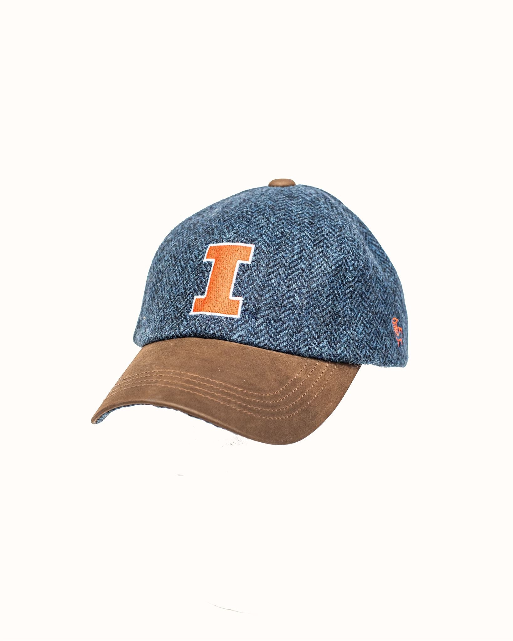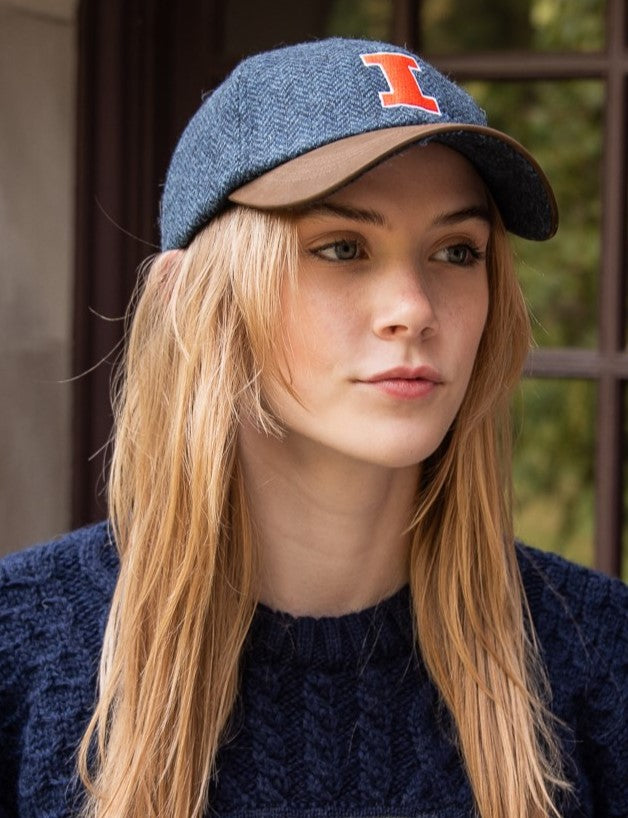 Blue Herringbone Wool Baseball Cap with Leather Bill