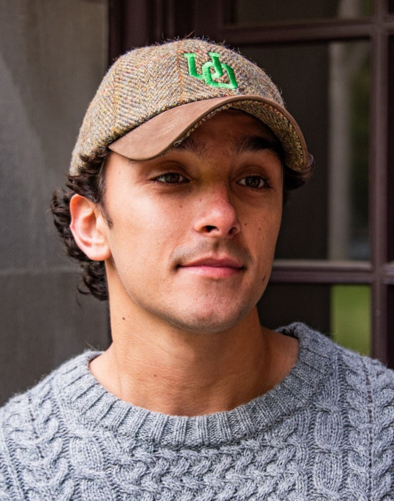 Green Herringbone Tweed Baseball Cap with Leather Bill (Oregon)