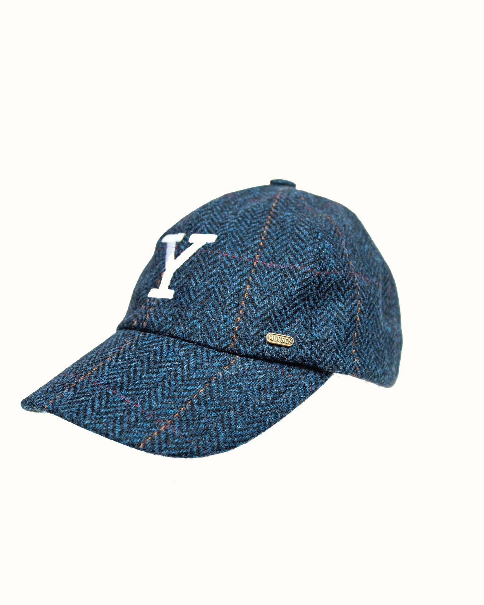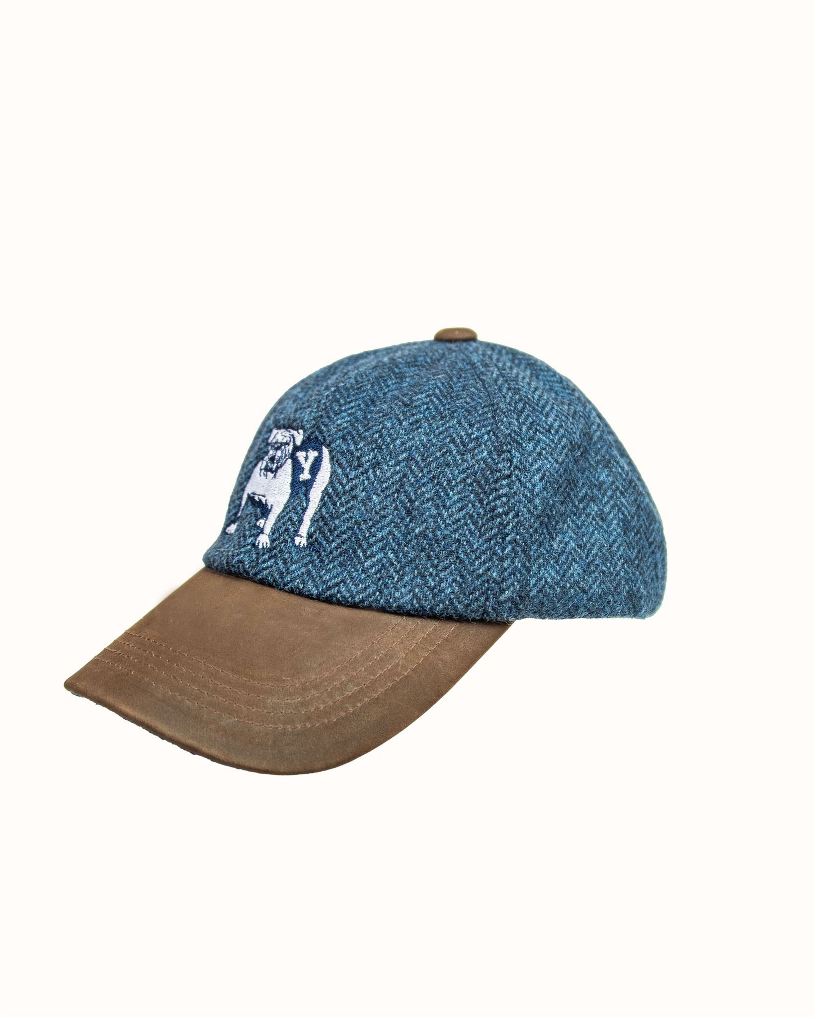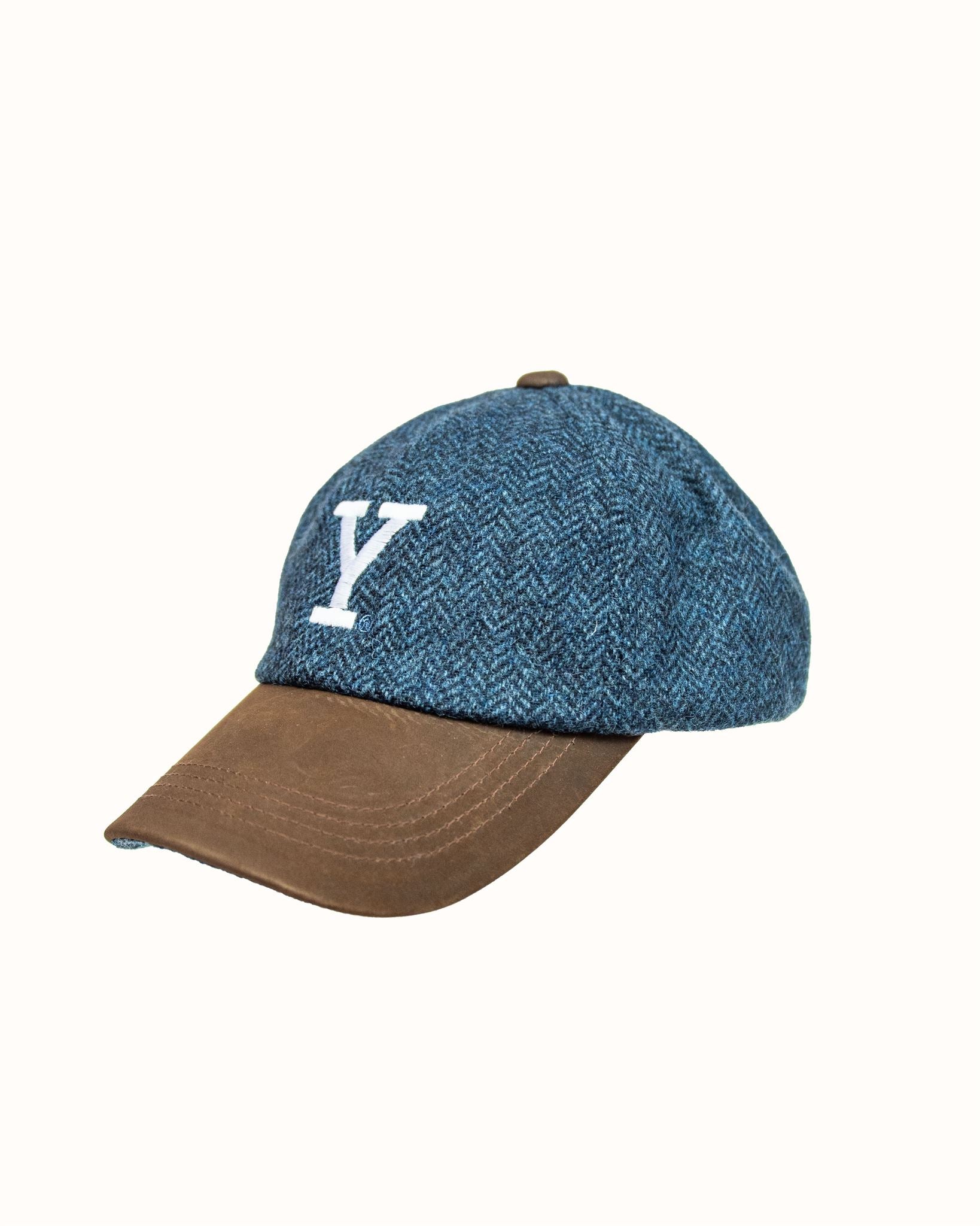 Blue Herringbone Wool Baseball Cap with Leather Bill